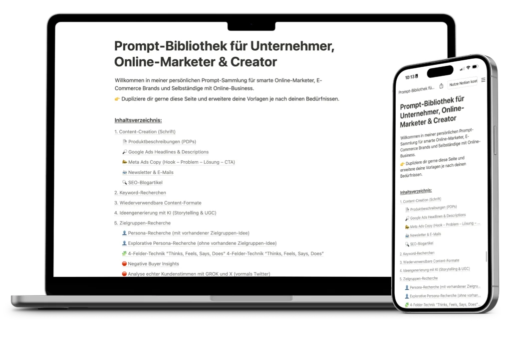 In dieser Notion-Galerie findest du Prompts, mit denen wir täglich arbeiten – von Google Ads über SEO bis Copywriting. Sie wird laufend aktualisiert und bringt deine KI-Arbeit aufs nächste Level.